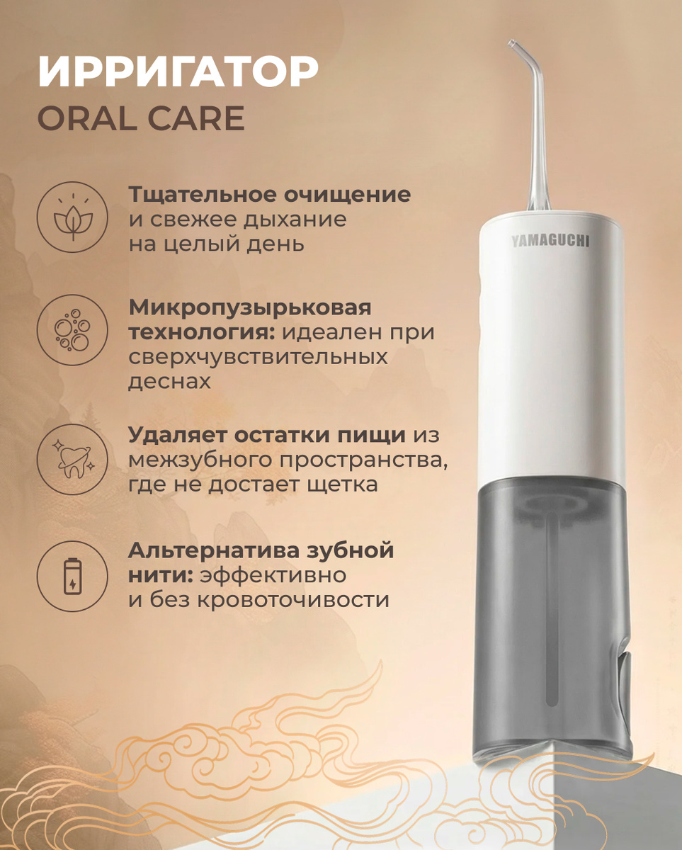 Но даже самая лучшая щетка не может полностью вычистить все из узких межзубных пространств и пародонтальных карманов. Здесь на сцену выходит ирригатор. Yamaguchi Oral Care — это устройство, которое подает воду под давлением, превращая ежедневную гигиену в профессиональный уход.