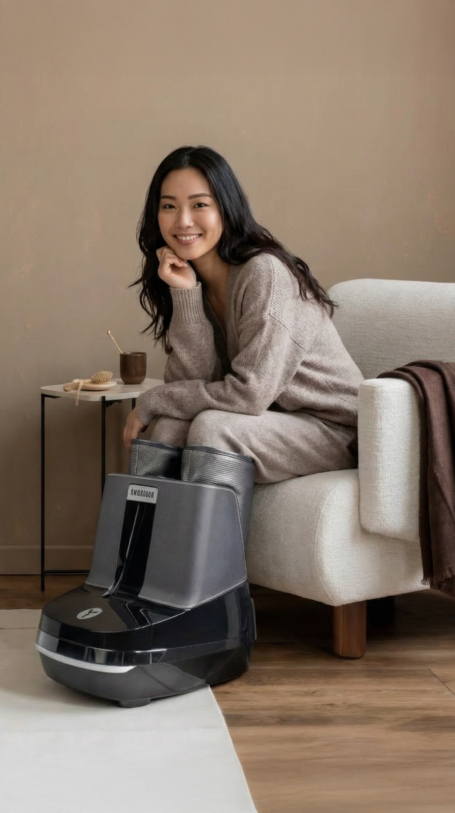 Интерьерный пуфик-массажер 2в1: ролики для глубокого разминания, воздушная компрессия для улучшения кровообращения и прогрев в крышке пуфика для расслабления мышц.